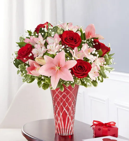 The key to an unforgettable Valentine’s. Our timeless red and pink bouquet is designed in a clear vase tied with red satin ribbon to help unlock all those feelings in your heart