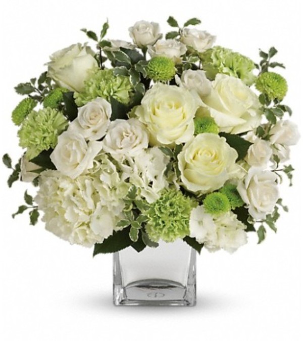 Let your love shine! No matter the recipient or the occasion, this stunning monochromatic mix of hydrangea and roses, hand-delivered in a silver cube, is destined to delight and inspire.